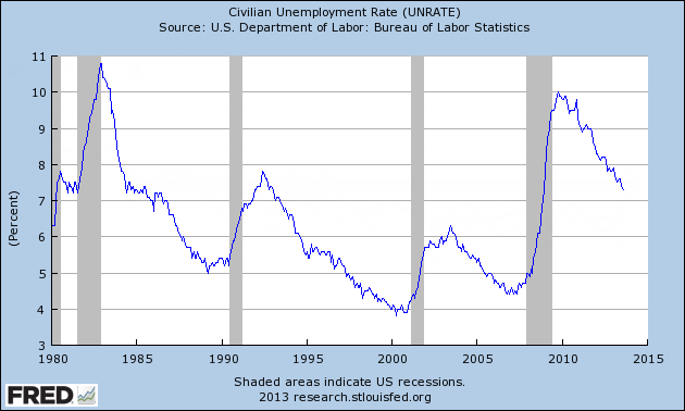 The official unemployment rate is 7.3%. However, if you start counting all the people who want a job but gave up, all the people with part-time jobs that want a full-time job, all the people who dropped off the unemployment rolls because their unemployment benefits ran out, etc., you get a closer picture of what the unemployment rate is. That number is in the last row labeled U-6.